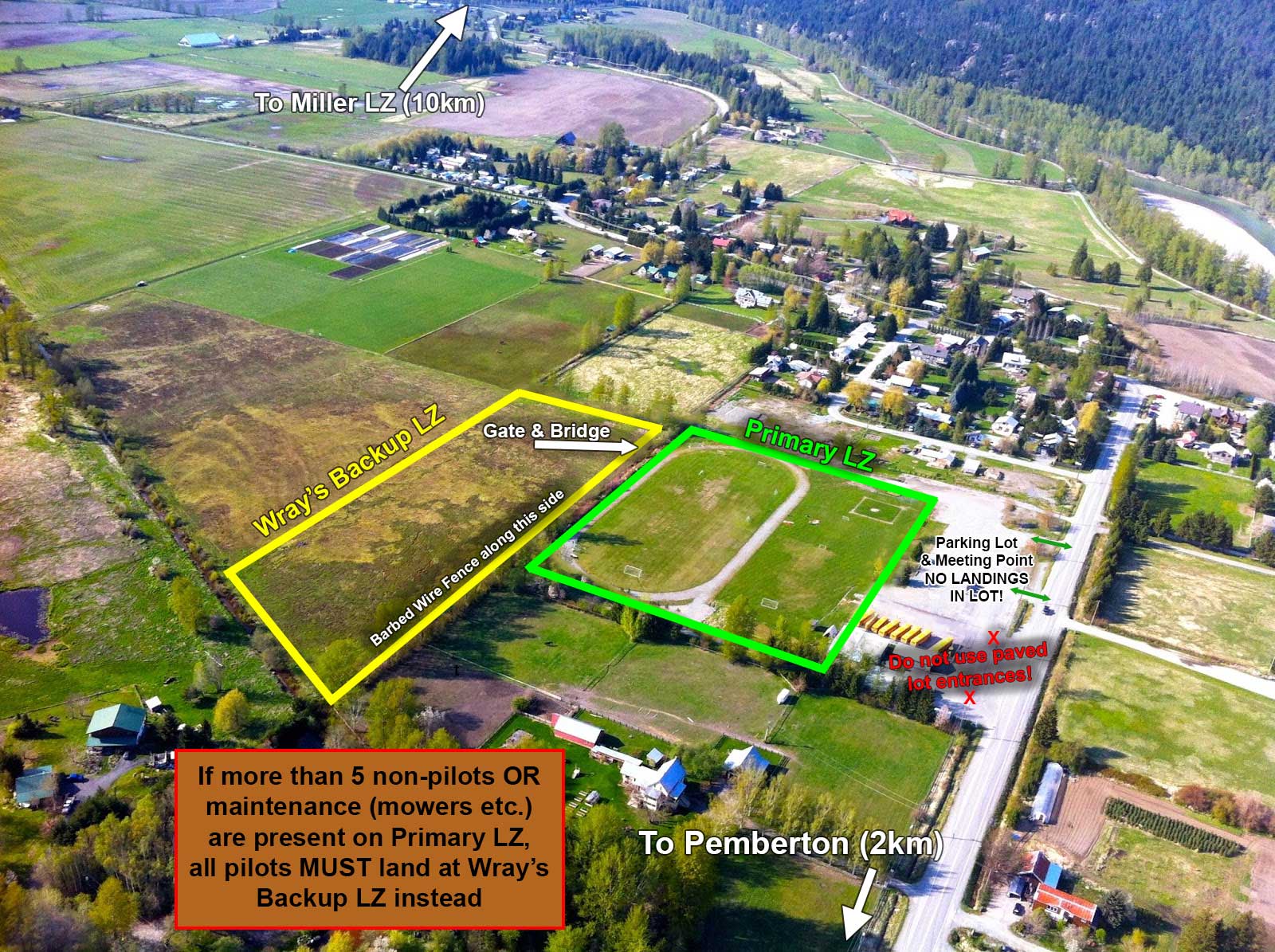 Both LZs are located along the west side of Pemberton Meadows Road, 1.5km north of the town center of Pemberton (just prior to Taylor Rd.). The sports field is obvious, with a large parking area in front… the Wray’s field is directly behind it, across a ditch. There is a bridge for access to the Wray’s field located in the NW corner of the sports field (the back right corner from the parking lot). MAKE SURE TO KEEP THE GATES CLOSED BETWEEN THE TWO LZs… there are regularly a few cows on the Wray’s property.