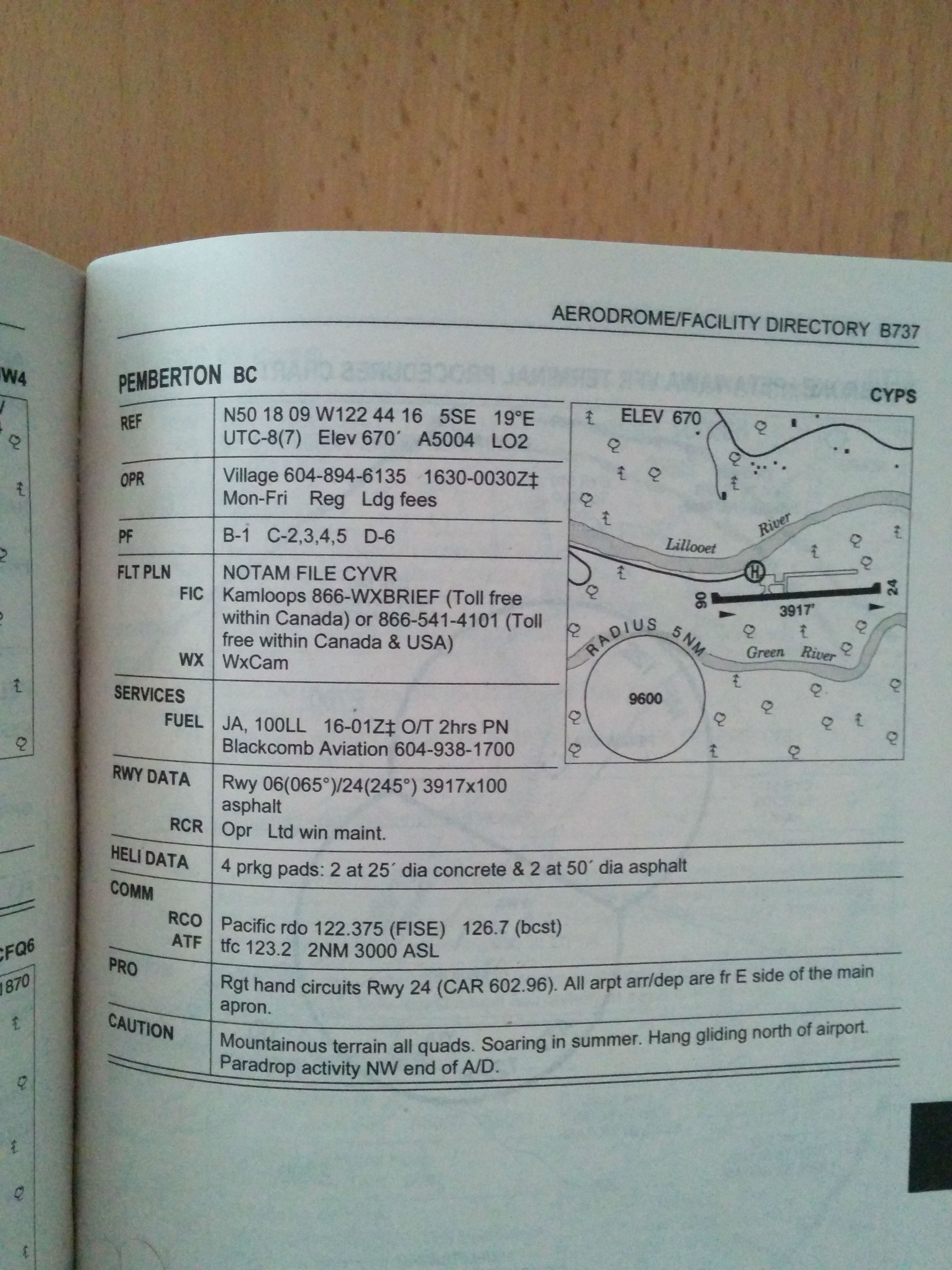 As shown in the CFS below, the approach to the airport for powered aircraft when the wind is blowing from the south-west is a RIGHT turn approach starting downwind over the industrial part of the town of Mt. Currie, turning RIGHT past the airport, then another RIGHT turn to line up with the runway. When winds are from the east, the approach is a standard left turn approach. Both approaches have helicopters and airplanes flying low between launch and the airport, do not be there! If you must land there and need to lose altitude, you may do it safely over the scrub to the south closer to the mountain, as aircraft will likely not traverse that area.